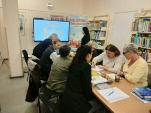 Główna część spotkania koncentrowała się na tym, jak działają fake newsy, na czym polega manipulacja medialna i w jaki sposób tworzą się bańki informacyjne. Dowiedzieliśmy się czym od siebie różnią się dezinformacja, misinformacja i malinformacja. Szczególnie ważnym elementem była rozmowa o emocjach, szczególnie o tym, jak wpływają na nasze decyzje, ocenę wiarygodności źródeł i gotowość do udostępniania niesprawdzonych treści. Wiedzę tę uczestnicy mogli od razu odnieść do praktyki podczas ćwiczeń. Zrobili test podatności na dezinformację. Prowadzące, Agnieszka Zdrojewska oraz Dorota Walasek-Woźniak, postawiły na konkretne rozwiązania. Uczestnicy poznali metody pracy z uczniami oraz narzędzia, które można wykorzystać niemal od razu po powrocie do swoich placówek. Rekomendowane były książki dotyczące problematyki dezinformacji oraz gry edukacyjne wspierające prowadzenie angażujących zajęć. Mamy nadzieję, że zdobyta wiedza i materiały pomogą jeszcze skuteczniej wspierać młodych ludzi w odpowiedzialnym i świadomym odbiorze informacji.